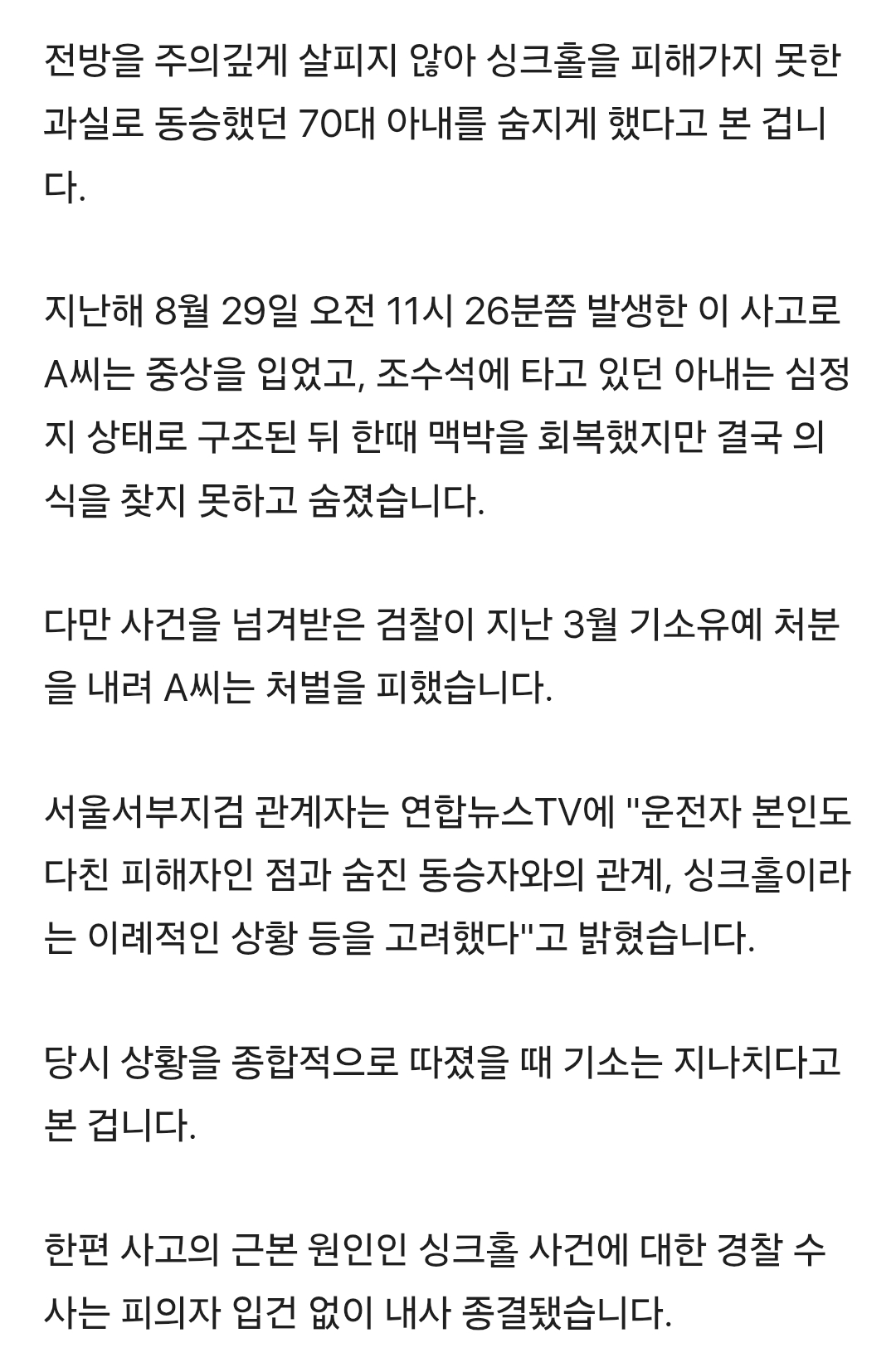 지난 해 서울 서대문구 연희동에서 발생한 땅꺼짐 사고와 관련해, 중상을 입은 피해 운전자가 오히려 처벌을 받을 뻔한 것으로 확인됐습니다. 연합뉴스TV 취재 결과, 서울 서대문경찰서는 당시