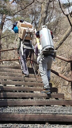 산에 LPG가스통을 들고 야외 취사한 산악회