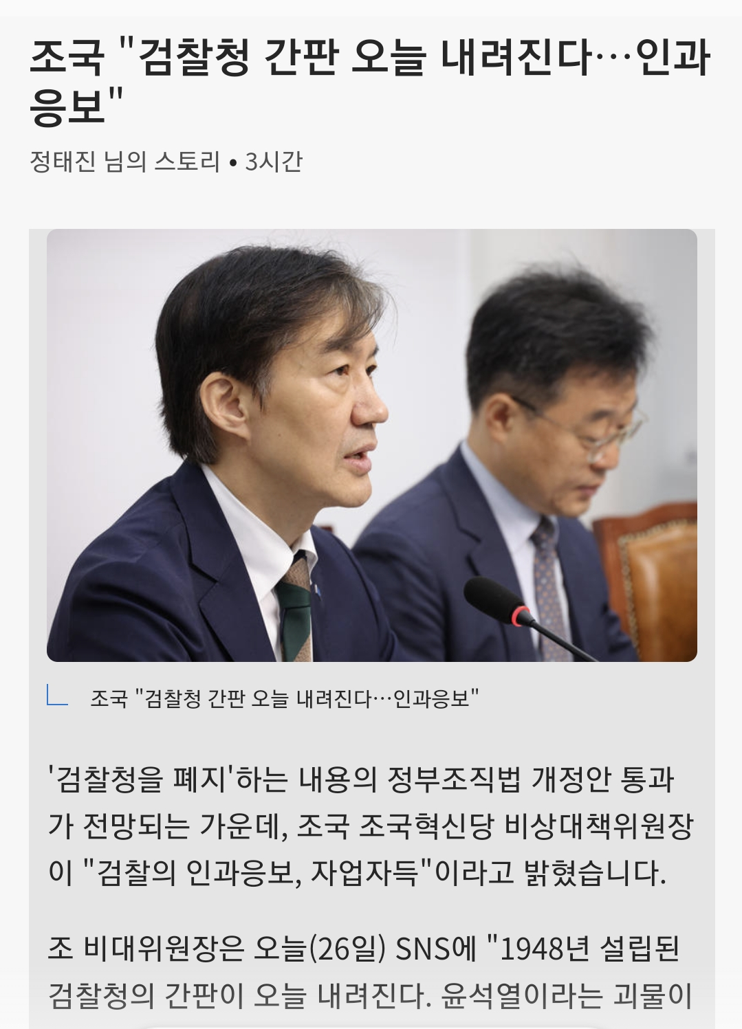 '검찰청을 폐지'하는 내용의 정부조직법 개정안 통과가 전망되는 가운데, 조국 조국혁신당 비상대책위원장이 "검찰의 인과응보, 자업자득"이라고 밝혔습니다. 조 비대위원장은 오늘(26일) SNS에 "