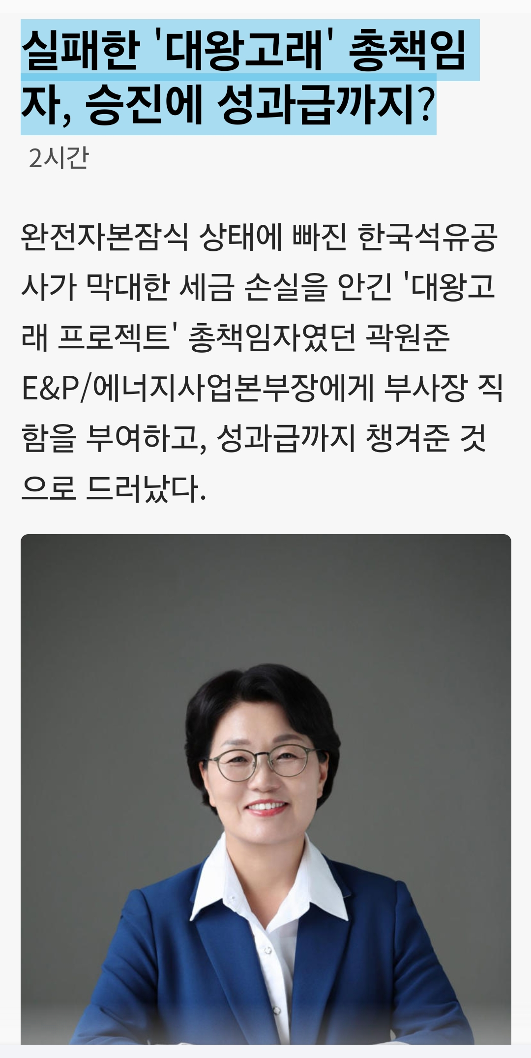 완전자본잠식 상태에 빠진 한국석유공사가 막대한 세금 손실을 안긴 '대왕고래 프로젝트' 총책임자였던 곽원준 E&P/에너지사업본부장에게 부사장 직함을 부여하고, 성과급까지 챙겨준 것으로