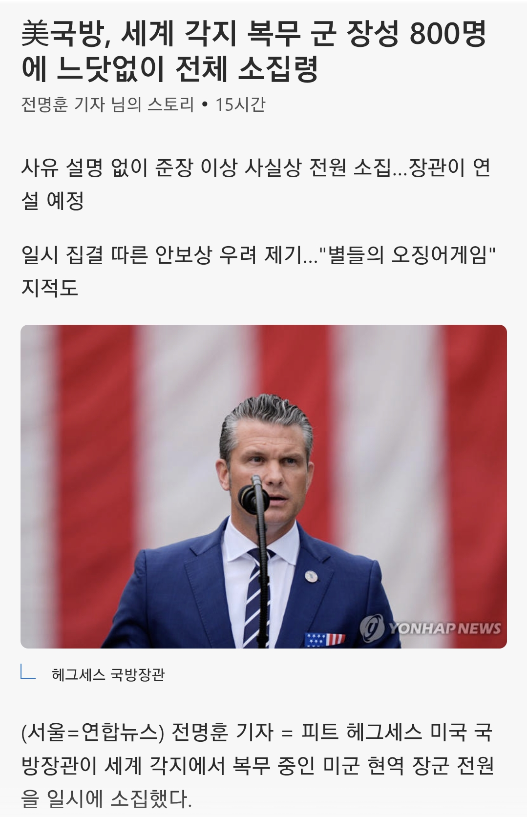 美국방, 세계 각지 복무 군 장성 800명에 느닷없이 전체 소집령 News2025. 9. 27. 00:53