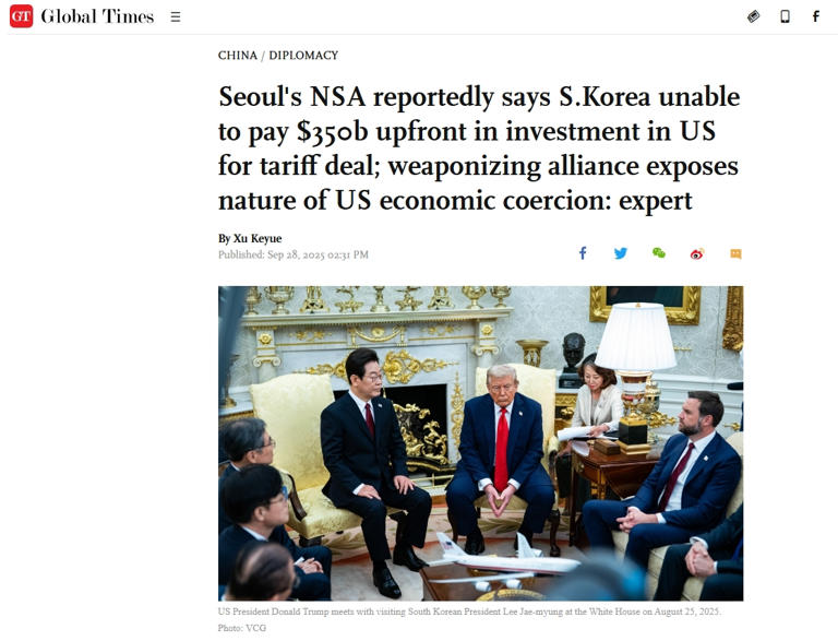 중국 관영매체가 도널드 트럼프 대통령이 한국에 요구한 ‘3500억 달러 선불’ 논란과 관련해 날이 선 비판을 쏟아냈다.관영 영문 매체 글로벌타임스는 28일(현지시간) 한국이 미국에 투자하기로