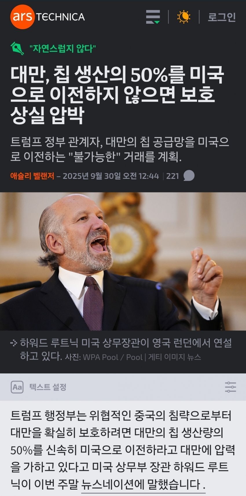 러트닉:대만은 보호받고 싶으면 칩생산량의 절반을 넘겨라 News2025. 9. 30. 15:43