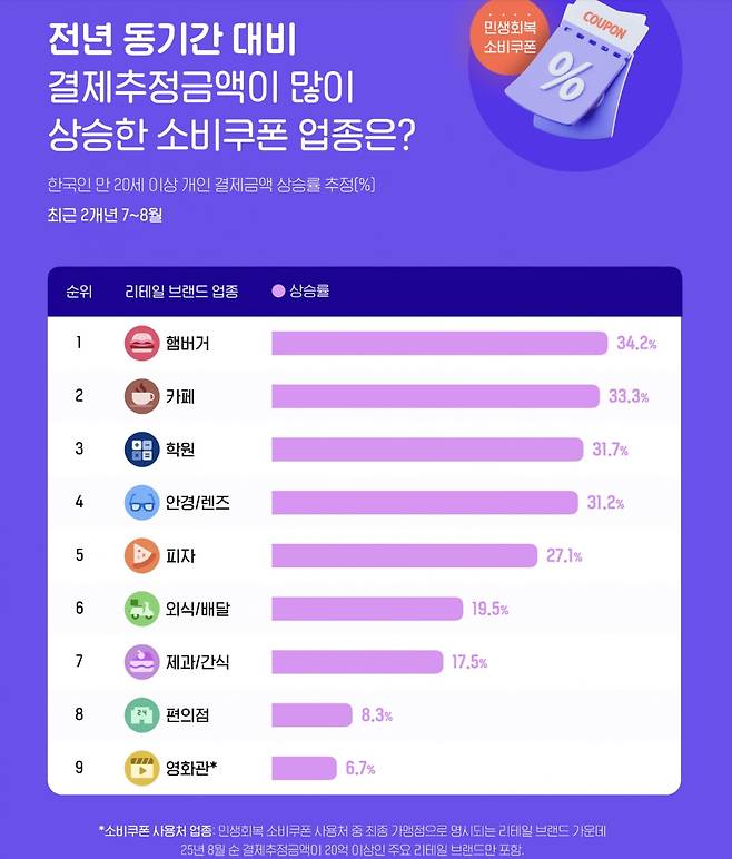 햄버거와 카페, 학원 같은 생활밀착형 업종에 소비쿠폰 사용이 집중됐다는 분석이 나왔다. 1일 와이즈앱·리테일이 발표한 ‘민생회복 소비쿠폰 효과’ 분석에 따르면 지난 7~8월 만 20세 이상