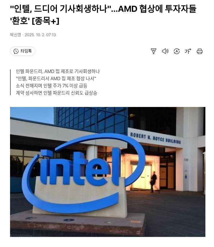 "인텔, 드디어 기사회생하나"…AMD 협상에 투자자들 '환호' [종목+] News2025. 10. 2. 12:32