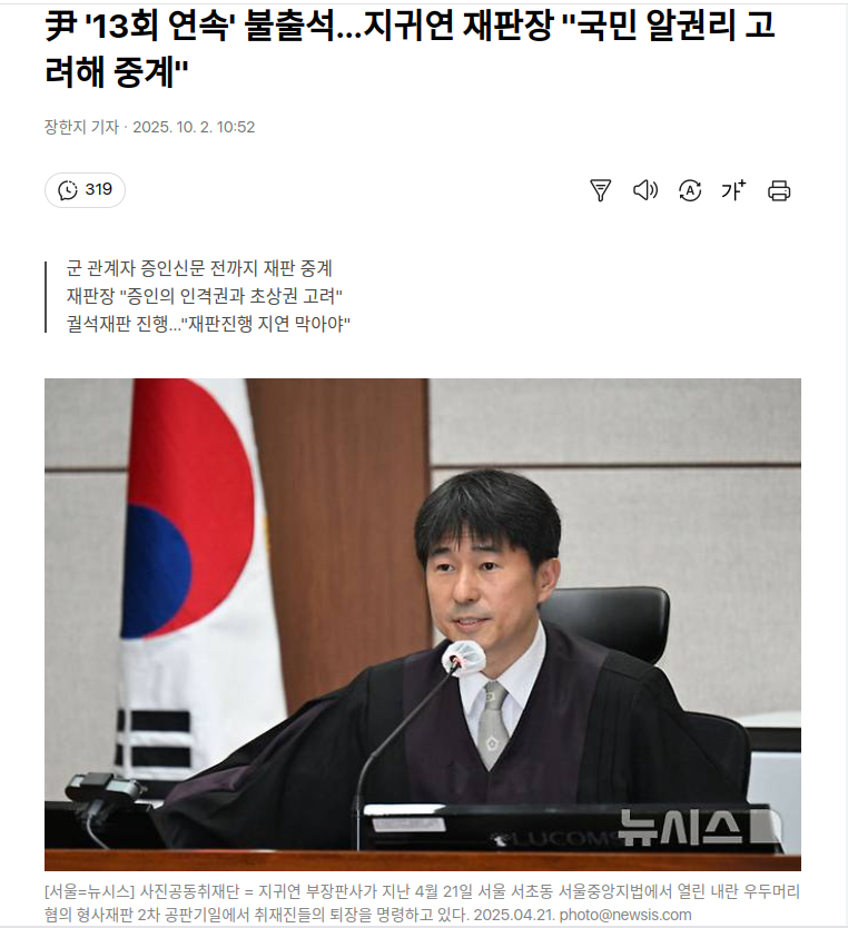 尹 '13회 연속' 불출석…지귀연 재판장 "국민 알권리 고려해 중계", 첫 중계 재판도 불출석…13회 연속 News2025. 10. 2. 12:40