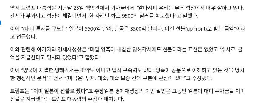 한국보다 앞서 미국과 관세 협상을 타결한 일본이 대미 투자금 5500억 달러(한화 약 772조 원) 중 실제 투자는 1~2%에 불과할 것이라는 주장을 내놓았다. 이번 발언은 좀처럼 합의점을 찾지 못하는