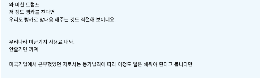 트럼프의 발언은 협상용 과장 카드이며, 한국도 기지 사용료·투자 조건·전략적 자율성 확보 등으로 맞대응할 수 있는 여지가 충분합니다. 단, 감정적 대응보다는 제도적·전략적 접근이 필요하며, 향후 미국과 NATO 수준의 한미동맹의 재정의가 불가피할 수 있습니다.