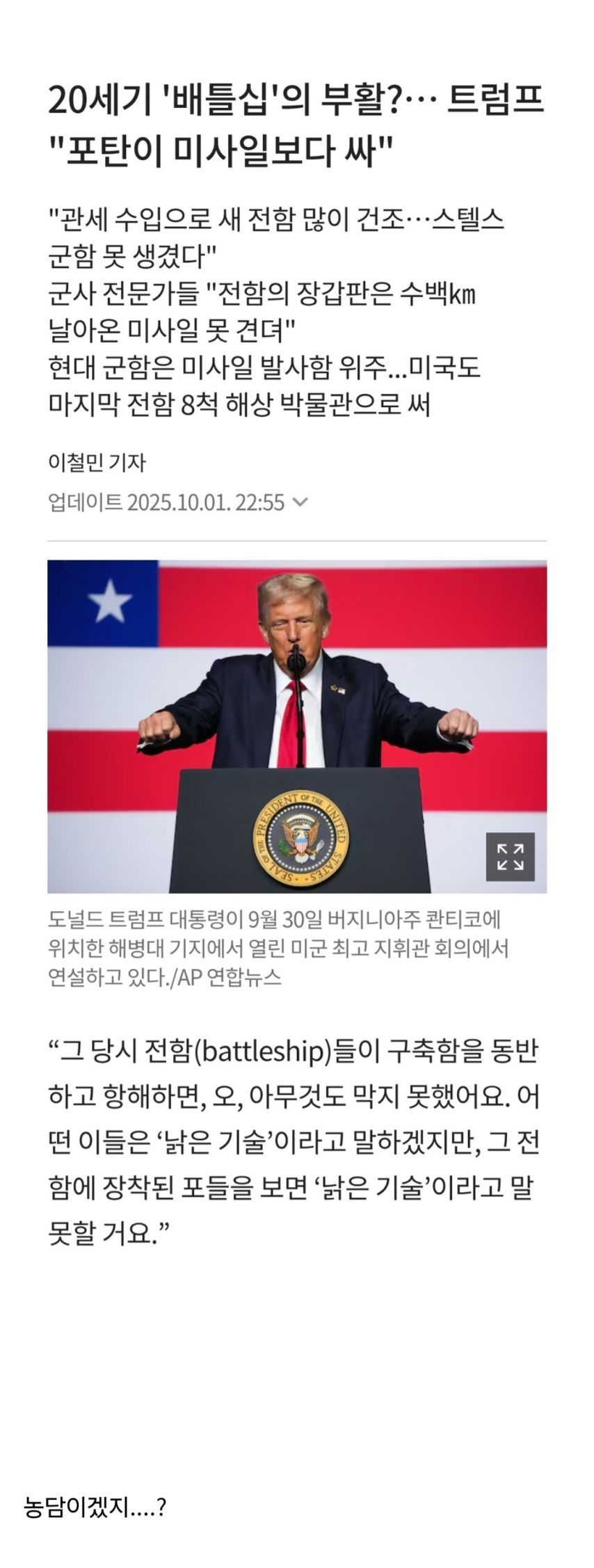 트럼프, 전함 부활시키겠다. 20세기 ‘배틀십’의 부활?… 트럼프 “포탄이 미사일보다 싸” News2025. 10. 3. 00:38