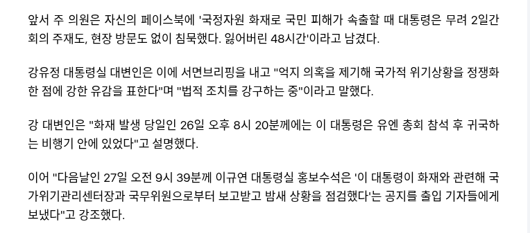 대통령실은 3일 국가정보자원관리원 화재 사고와 관련해 국민의힘 주진우 의원이 '이재명 대통령이 상황 대처를 하지 않았다'는 취지로 주장한 것에 대해 "명백한 허위사실 유포"라며 강한 유감