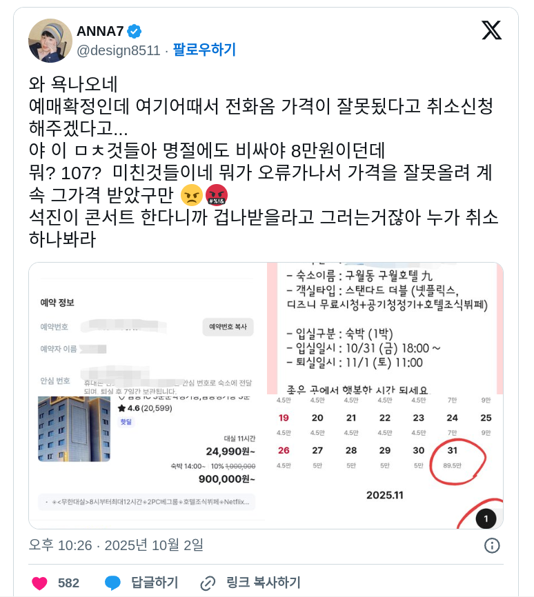 BTS 진 콘서트 한다니까 방값 20배 올리고 예약 취소한다고 연락한 호텔 News2025. 10. 4. 12:11