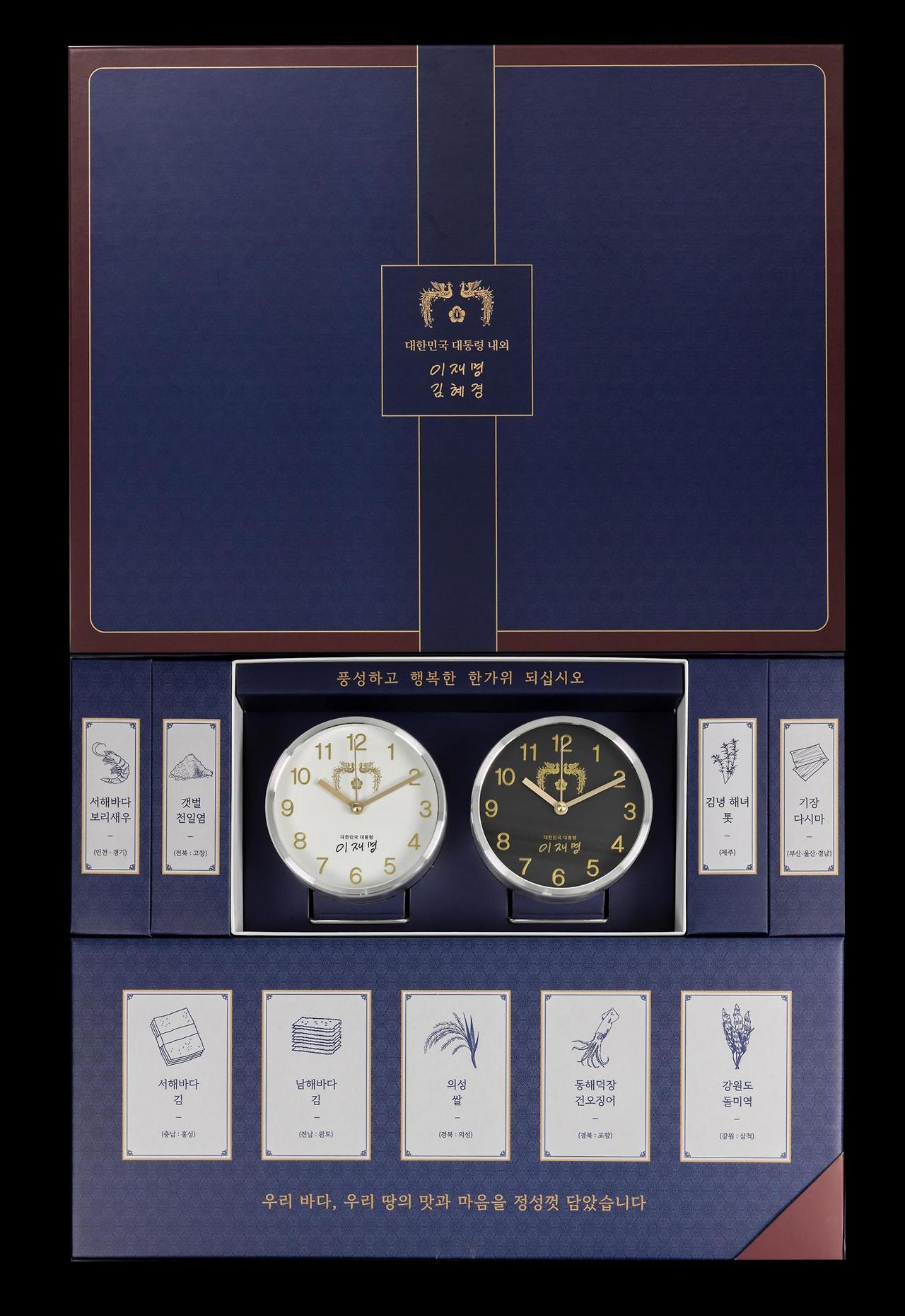 대통령 시계와 8도 수산물, 우리 쌀 등으로 구성됐다. 서해를 상징하는 보리새우(인천·경기)·김(충남 홍성)·천일염(전북 고창)과 남해를 상징하는 김(전남 완도)·톳(제주)·다시마(부산·울산·경남), 동해를 상징하는 건오징어(경북 포항)·돌미역(강원 삼척) 등이다.
