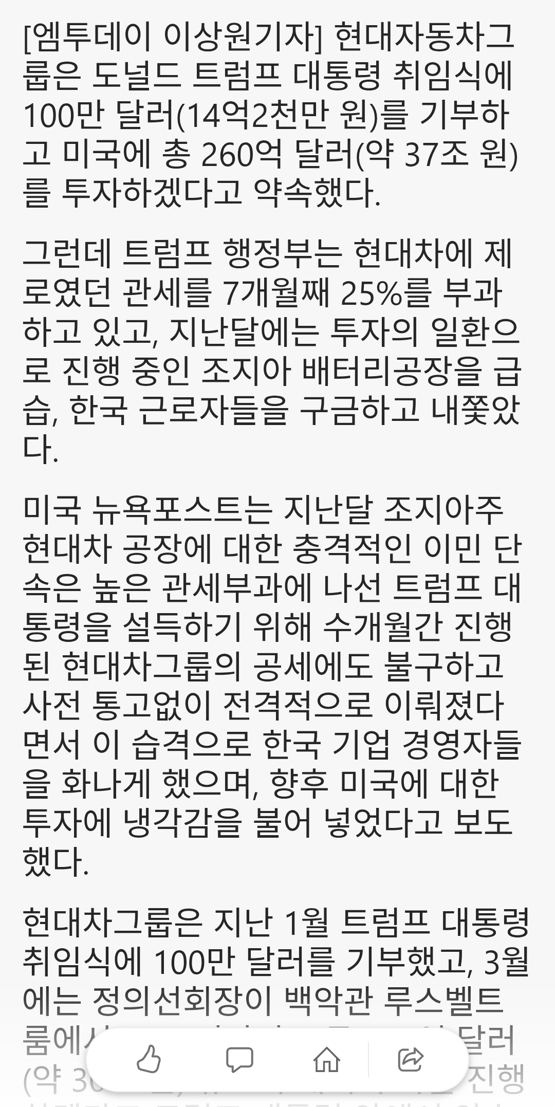 [엠투데이 이상원기자] 현대자동차그룹은 도널드 트럼프 대통령 취임식에 100만 달러(14억2천만 원)를 기부하고 미국에 총 260억 달러(약 37조 원)를 투자하겠다고 약속했다.그런데 트럼프 행정부