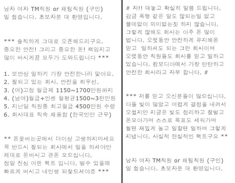 "부모님 걸고 저희 쪽은 일하기 안전한 지역이에요." 최근 캄보디아에서 한국인 납치·고문 사건이 끊이지 않는 상황에도 온라인에서는 여전히 고수익을 내세우며 캄보디아에서 일할 직원을 찾