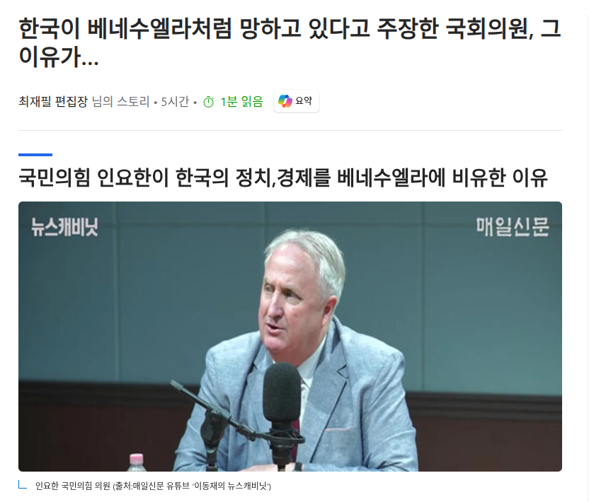 한국이 베네수엘라처럼 망하고 있다고 주장한 국회의원, 인요한, 그 이유가…