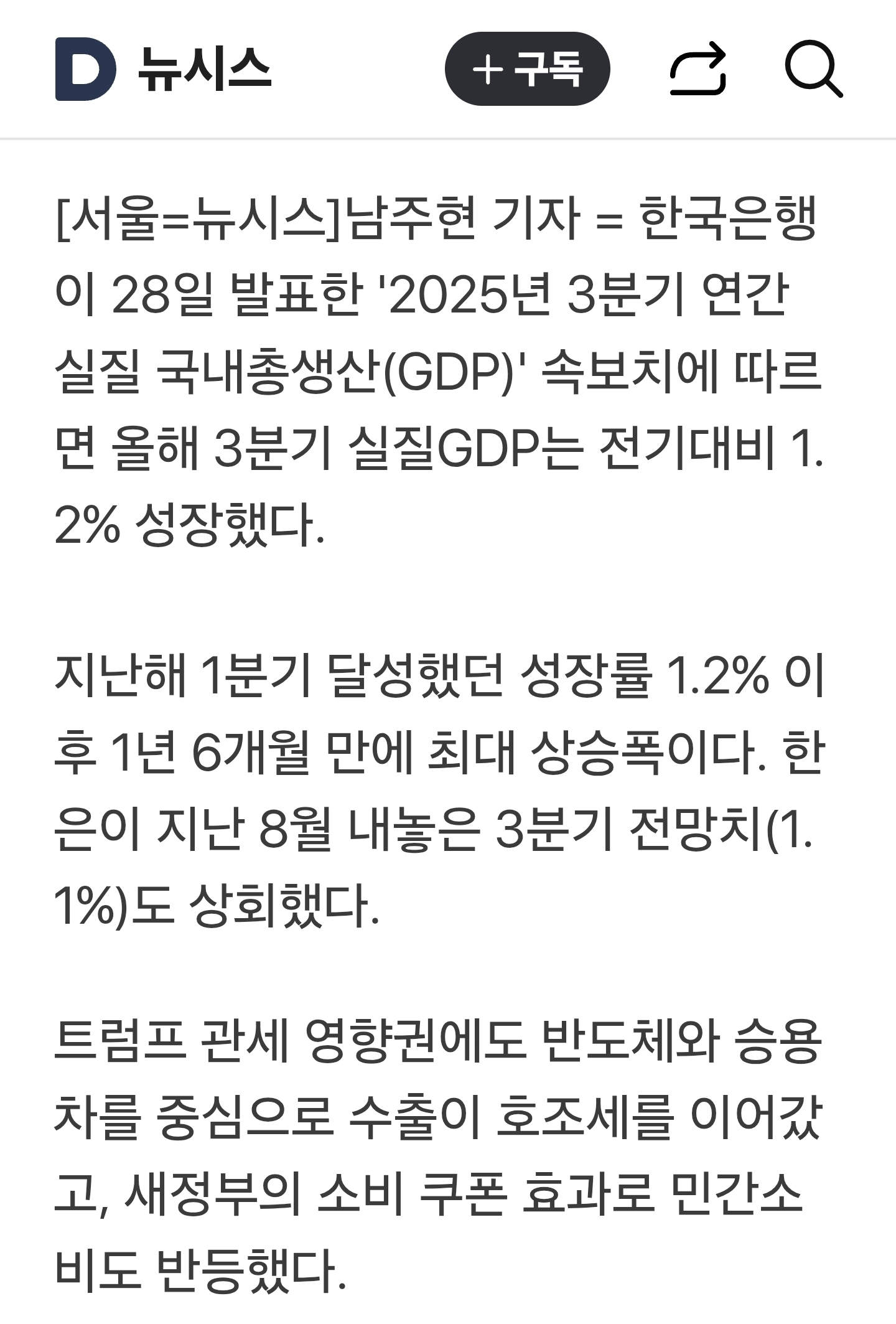 2025년 3분기 GDP 1.2% 성장…1년6개월래 최대, "반도체 끌고, 소비쿠폰 밀고" 내수 회복에 전망치 상회 News2025. 10. 28. 08:14
