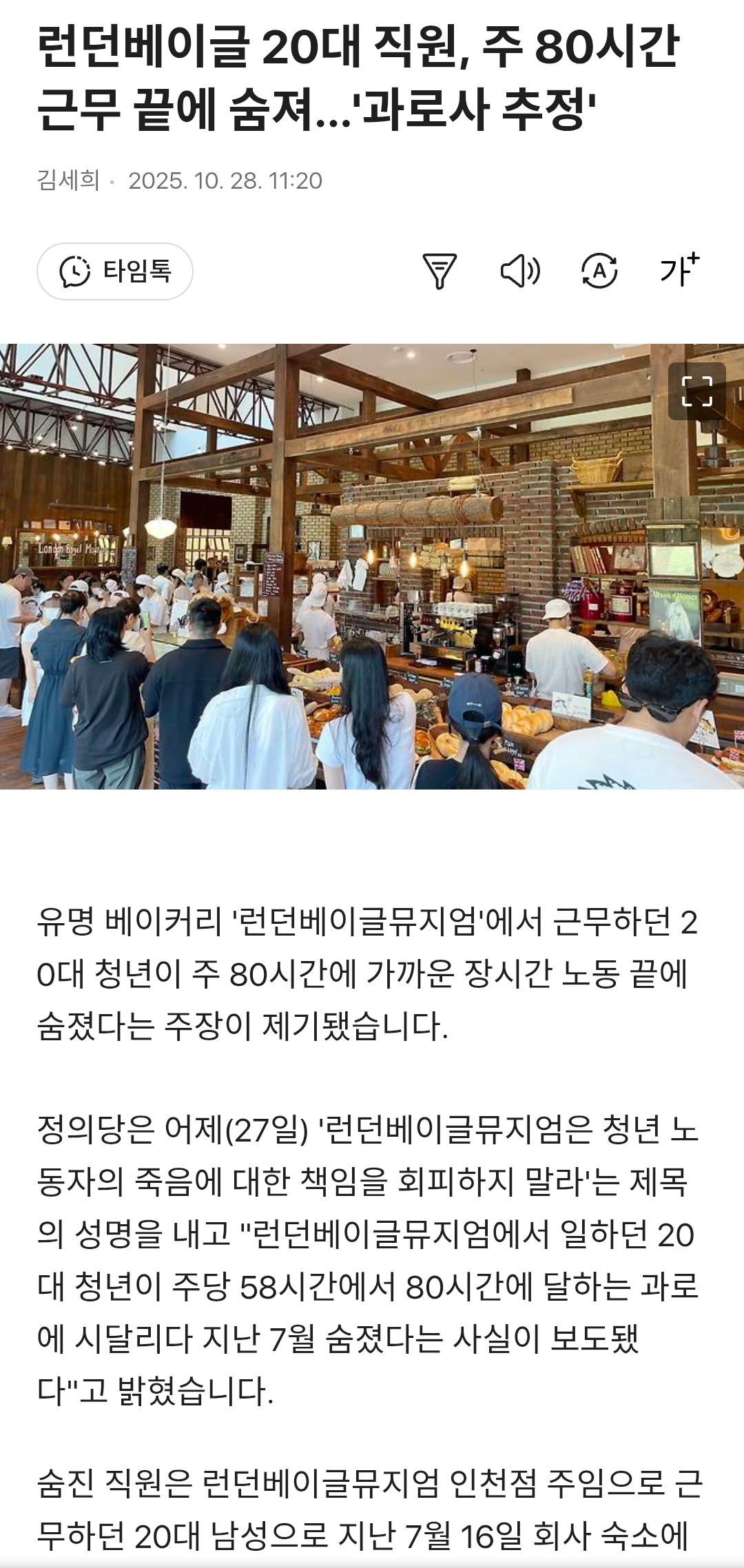 유명 베이커리 '런던베이글뮤지엄'에서 근무하던 20대 청년이 주 80시간에 가까운 장시간 노동 끝에 숨졌다는 주장이 제기됐습니다. 정의당은 어제(27일) '런던베이글뮤지엄은 청년 노동자의 죽