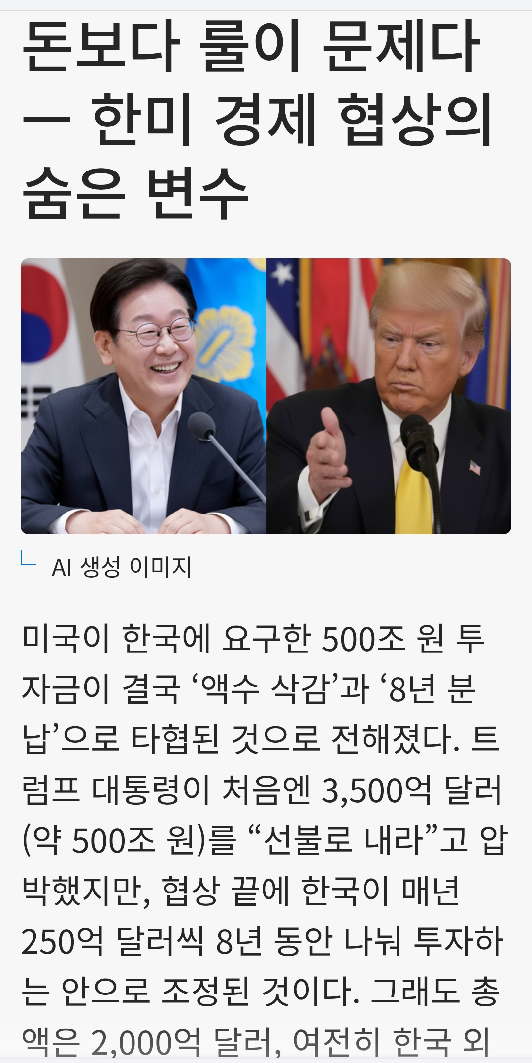 미국이 한국에 500조원(약 3500억 달러)의 대미 선투자를 요구했고, 이에 대해 이재명 정부가 액수를 낮추고 8년에 걸쳐 분할 납부하는 방안으로 타협하는 중이라는 보도가 주요 내용이다.