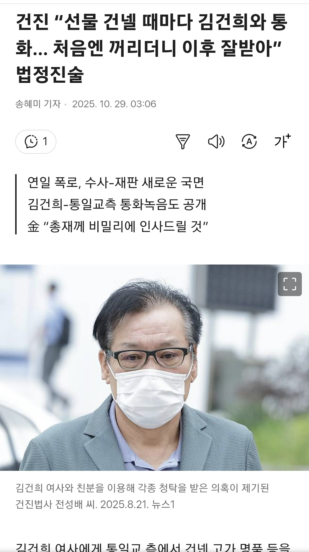 건진 “선물 건넬 때마다 김건희와 통화… 처음엔 꺼리더니 이후 잘받아” 법정진술