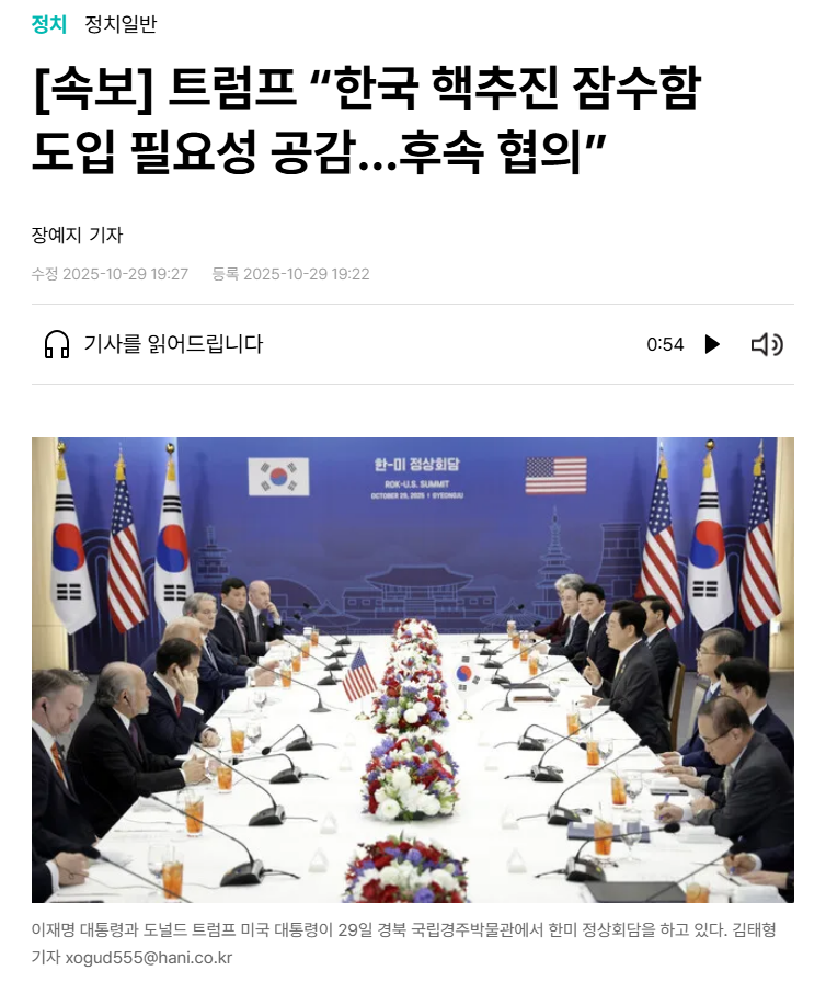[속보] 트럼프 “한국 핵추진 잠수함 도입 필요성 공감…후속 협의” News2025. 10. 29. 19:55