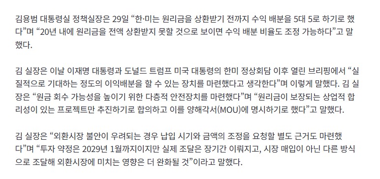 [속보] 대통령실 “한 미 수익배분 5대5…원리금 회수 전까지” |