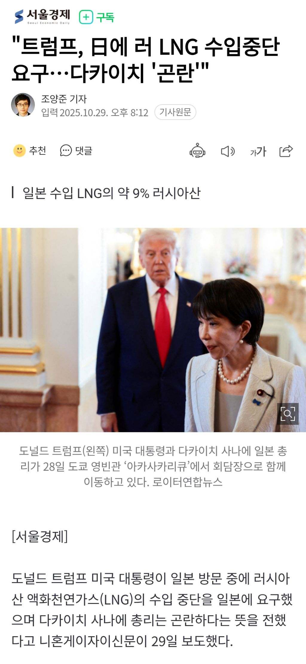 [서울경제] 도널드 트럼프 미국 대통령이 일본 방문 중에 러시아산 액화천연가스(LNG)의 수입 중단을 일본에 요구했으며 다카이치 사나에 총리는 곤란하다는 뜻을 전했다고 니혼게이자이신문이