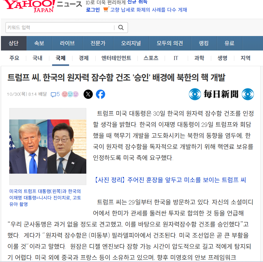 중국, 한국 핵추진 잠수함에 “지역 안정 해치는 일 안 되길” https://v.daum.net/v/20251030163040613 중국, 한국 핵추진 잠수함에 “지역 안정 해치는 일 안 되길”중국이 한국의 핵추진 잠수함 건조 추