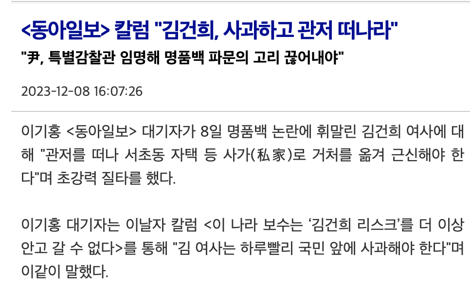 동아일보의 분노, "김건희는 관저 떠나라" 2023년 12월 News2023. 12. 11. 13:32