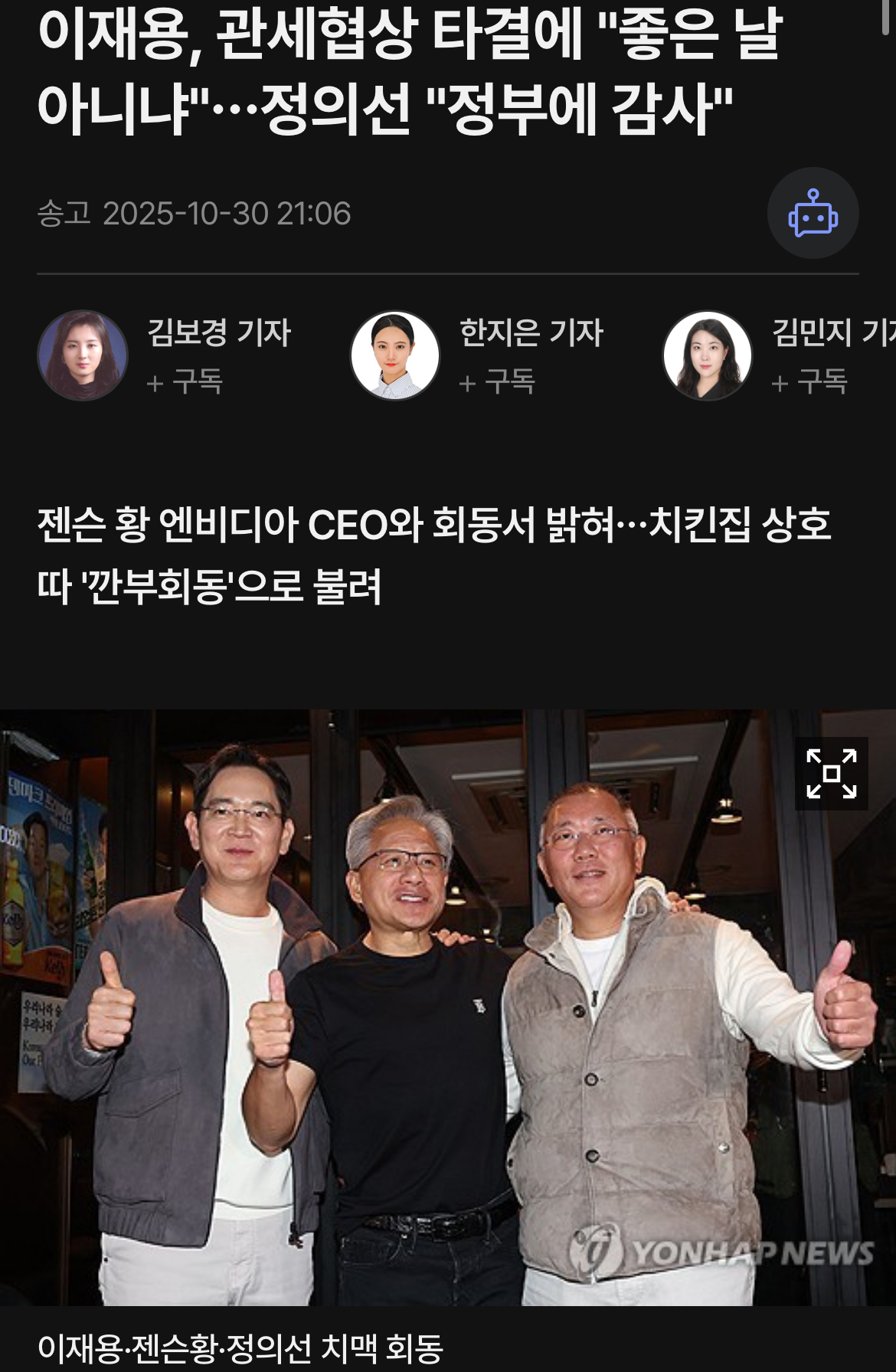 재벌3명 강남 모치킨집에서 도원결의 그리고 헌팅중, 이재용, 관세협상 타결에 "좋은 날 아니냐"…정의선 "정부에 감사" 'AI 깐부'로 뭉친 젠슨 황·이재용·정의선… 빅딜 성사 임박 [경주 APEC] News2025. 10. 30. 21:32