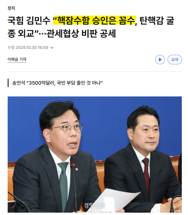 국힘 김민수 “핵잠수함 승인은 꼼수, 탄핵감 굴종 외교”···관세협상 비판 공세 News2025. 10. 31. 13:01
