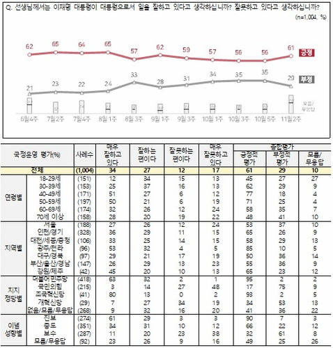 - 이재명 대통령 지지율: 최근 두 달 만에 60%대를 회복하며 61%를 기록했습니다(직전 대비 5%p↑). 대장동 이슈와 정국 혼란에도 불구하고 대통령 지지율은 오름세를 보임.hani+4