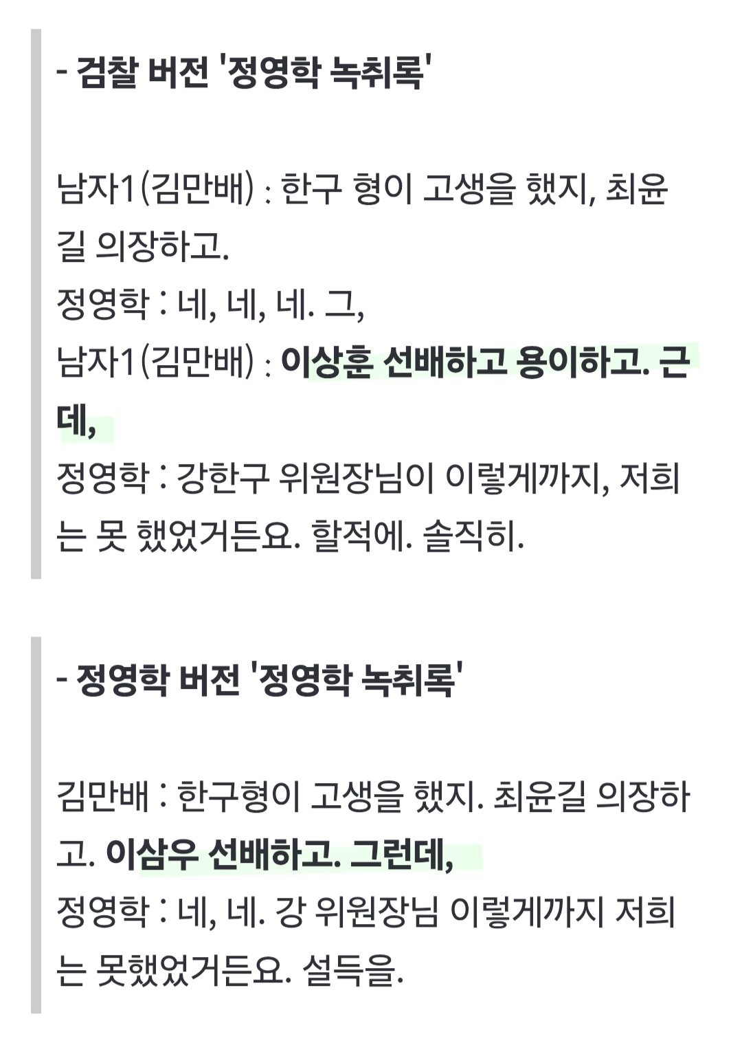 정영학 회계사 측은 녹취 원본에는 없던 "용이하고", "실장님", "윗 어르신들" 등 이재명 대통령과 측근을 겨냥한 표현이 검찰 버전에서 추가됐다고 밝히며, 수사방향에 맞춰 녹취 일부가 조작 또는 왜곡됐을 가능성을 지적했습니다. 이에 따라 정영학 회계사 측은 항소심 재판부에 의견서와 항소이유서를 제출할 계획입니다.