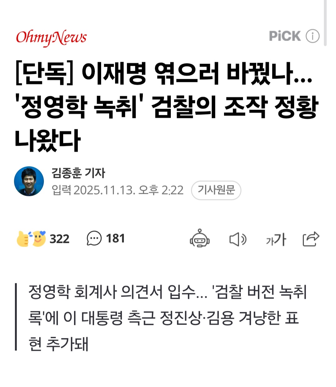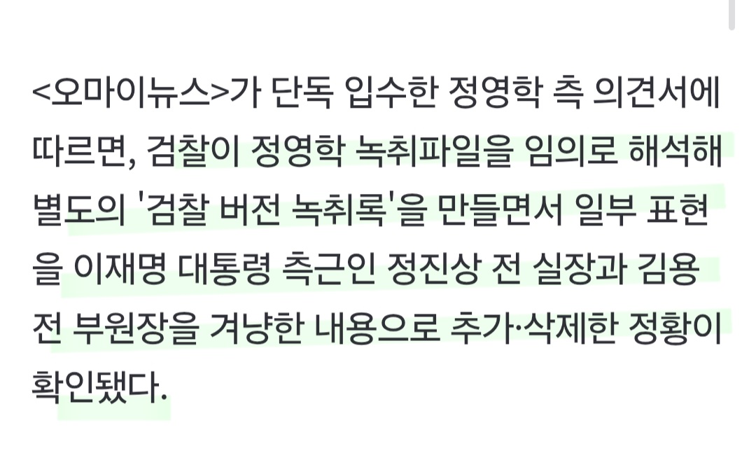 최근 대장동 개발 비리 사건의 주요 증거로 활용된 정영학 회계사 녹취파일이 검찰에 의해 일부 내용이 임의로 추가·삭제되는 등 '조작' 의혹이 제기됐습니다. 오마이뉴스의 단독 보도에 따르면, 검찰은 수사방향에 맞춰 원문에는 없던 “용이하고”, “실장님”, “윗 어르신들” 등의 표현을 녹취록에 삽입, 이재명 대통령과 그의 측근을 범죄구성의 주요 인물로 부각시킨 정황이 확인됐습니다.