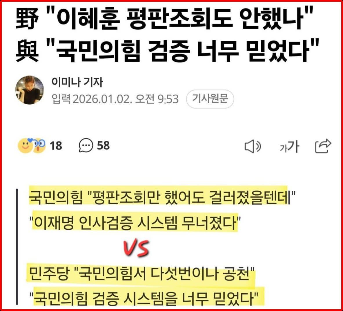 - ๋์์ ์ง๋ณด·๋ณด์ ์์ธก์์ “๊ตญ๋ฏผ์ํ์ด ์์ฐจ๋ก ๊ณต์ฒํ๊ณ ํค์ด ์ธ์ฌ๋ฅผ ์ด์ ์์ ‘๊ฒ์ฆ ๊ตฌ๋ฉ’์ด๋ผ ๋น๋ํ๋ ๊ฒ์ ์๊ธฐ๋ชจ์”์ด๋ผ๋ ๋นํ๋ ์ ๊ธฐ๋๋ฉฐ, ๊ณต์ฒ·๊ฒ์ฆ ์์คํ ์ ๋ฐ์ ์ ๋ขฐ๋๊ฐ ํ๋ค๋ฆฌ๊ณ ์๋ค.hani+1โ