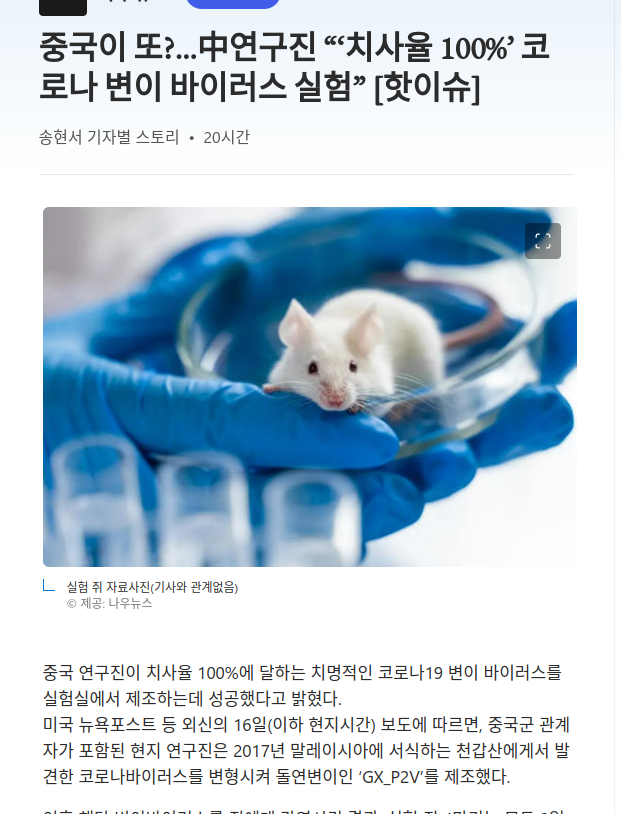 中연구진 “‘치사율 100%’ 코로나 변이 바이러스 실험” News2024. 1. 18. 11:01