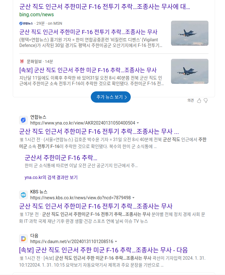 군산 직도 인근서 주한미군 F-16 전투기 추락…조종사는 무사 News2024. 1. 31. 10:25