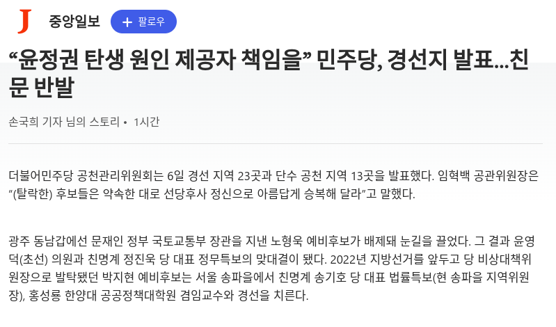 민주당, 경선지 발표 2024년 2월 중앙일보의 돌려까기 News2024. 2. 7. 02:12