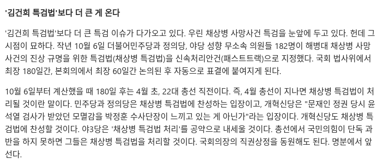 '김건희 특검법'보다 더 큰 게 온다. 디올백 스캔들보다 못지 않다. 채상병 특검법 4월 초 22대 총선 직전
