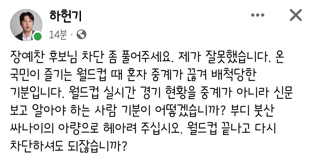 하헌기 장예찬 후보님 차단 좀 풀어주세요. 온 세상이 장예찬 News2024. 3. 15. 12:44