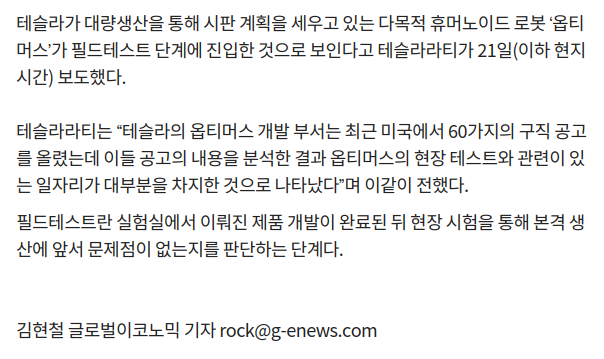 테슬라 옵티머스, 양산 전 단계 ‘필드테스트’ 채비 News2024. 3. 22. 09:22