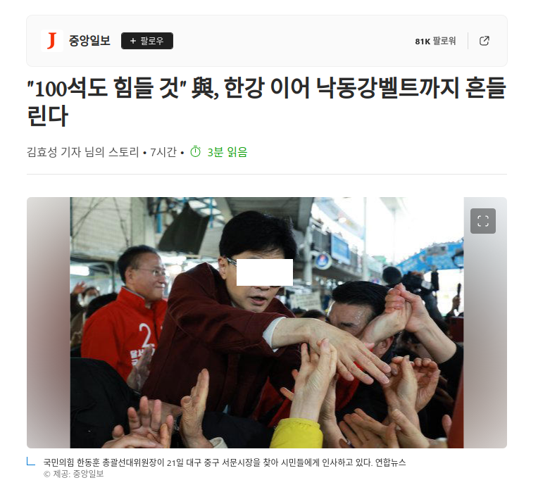 중앙, "100석도 힘들 것" 與, 한강 이어 낙동강벨트까지 흔들린다