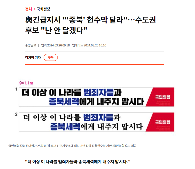 국힘긴급지시 "'종북관련' 현수막 달라"…수도권 후보 "싫다..난 안 달겠다" News2024. 3. 26. 12:28