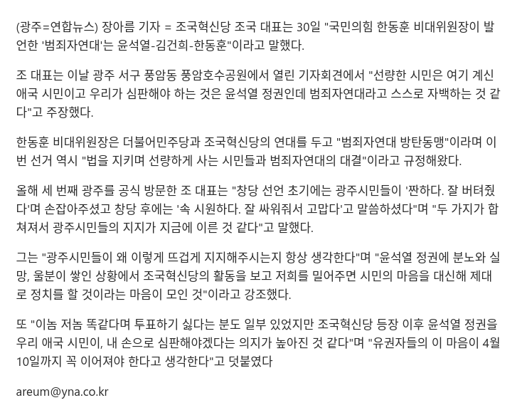 조국 "한동훈 '범죄자연대' 발언, 윤석열-김건희 연대 자백" News2024. 3. 30. 17:16