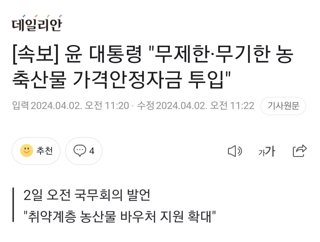 윤석열 대통령이 긴급 농축산물 가격안정자금을 무제한·무기한으로 투입하라고 지시했다. 윤 대통령은 2일 오전 국무회의 모두발언을 통해 이같은 지시와 함께 "취약계층에 대한 '농산물 바우