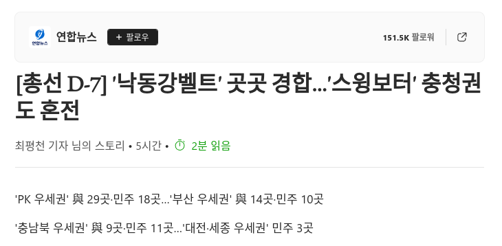 [총선 D-7] '낙동강벨트' 곳곳 경합…'스윙보터' 충청권도 혼전 News2024. 4. 3. 11:22