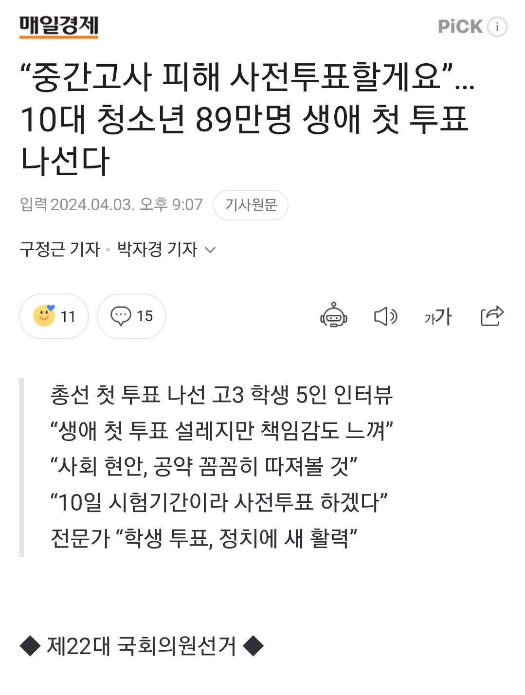 중간고사 피해 사전투표할게요”…10대 청소년 89만명 생애 첫 투표 나선다 News2024. 4. 4. 15:23