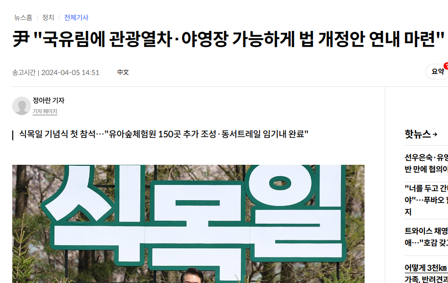 尹 "국유림에 관광열차·야영장 가능하게 법 개정안 연내 마련" News2024. 4. 5. 17:32