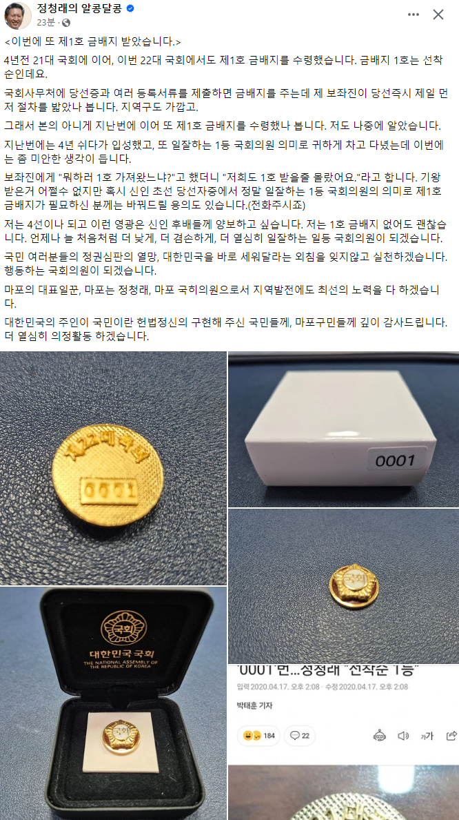 속보] 정청래 페북업 "금뱃지 받음