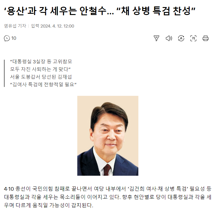 용산과 각세우는 안철수, 간보는? "채상병 특검 찬성" News2024. 4. 13. 00:01