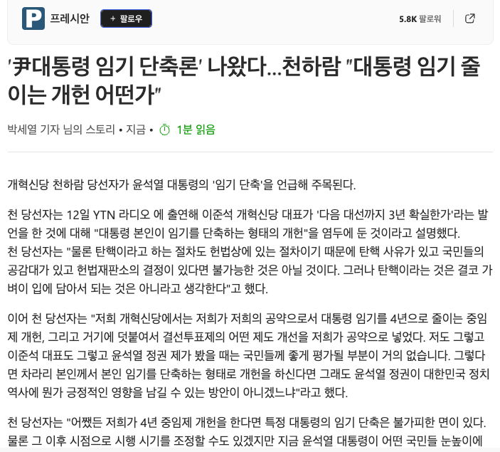 '尹대통령 임기 단축론' 나왔다…천하람 "대통령 임기 줄이는 개헌 어떤가" News2024. 4. 13. 21:37